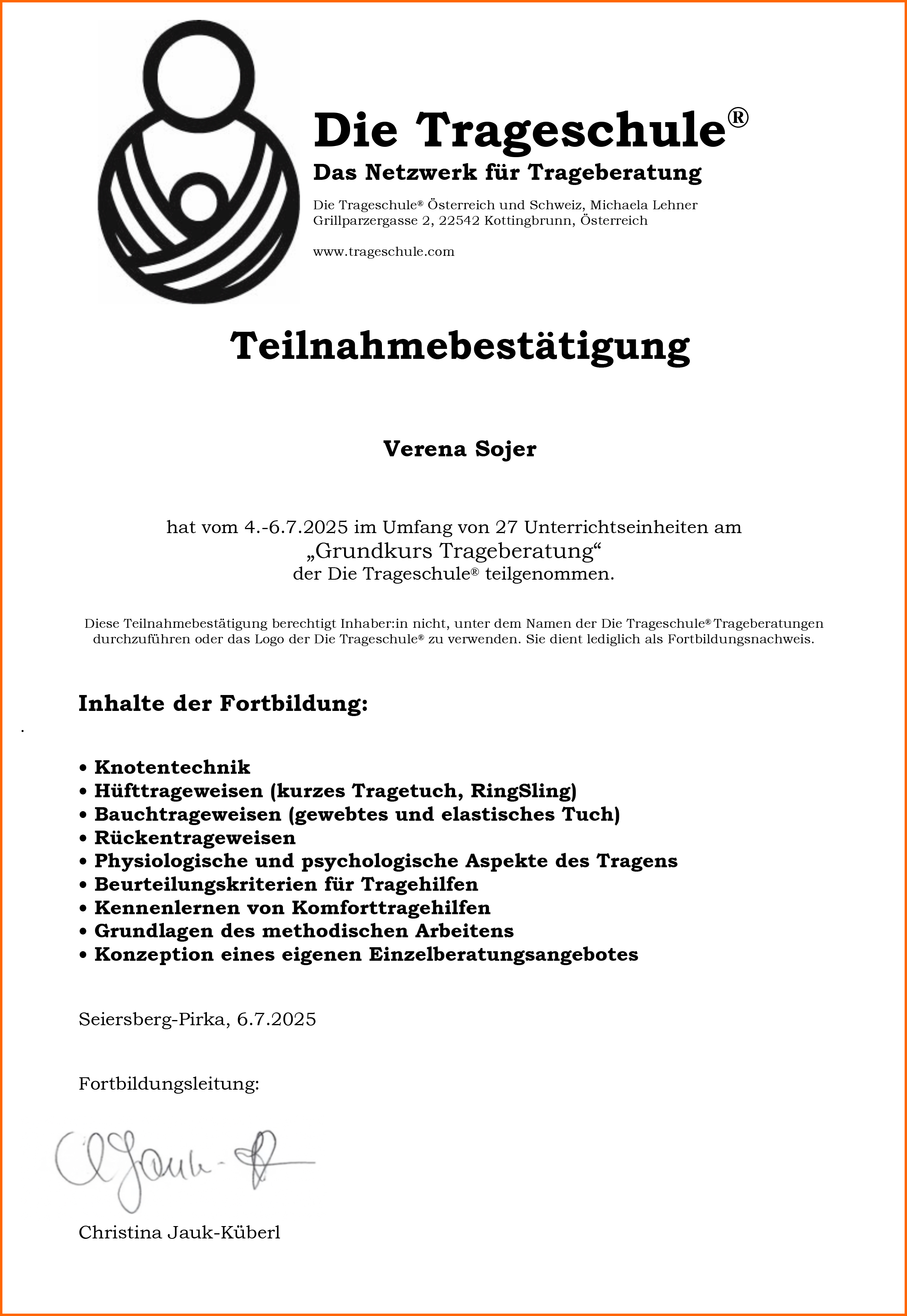 Beraterinnen: Charlotte Wimmer und Verena Sojer Charlotte und Verena sind eure erfahrenen Trageberaterinnen mit Herz. Individuell, einfühlsam und fachkundig begleiten wir euch auf dem Weg zur passenden Tragehilfe - für eine innige Bindung und entspannte Tragzeit. In unseren Beratungen stehen eure Bedürfnisse und die eures Babys im Mittelpunkt. Wir freuen uns auf euch! Hier finden Sie die Datenschutzerklärung und Einwilligung zur Tragetuchberatung. < Zurück zum Menü | |||